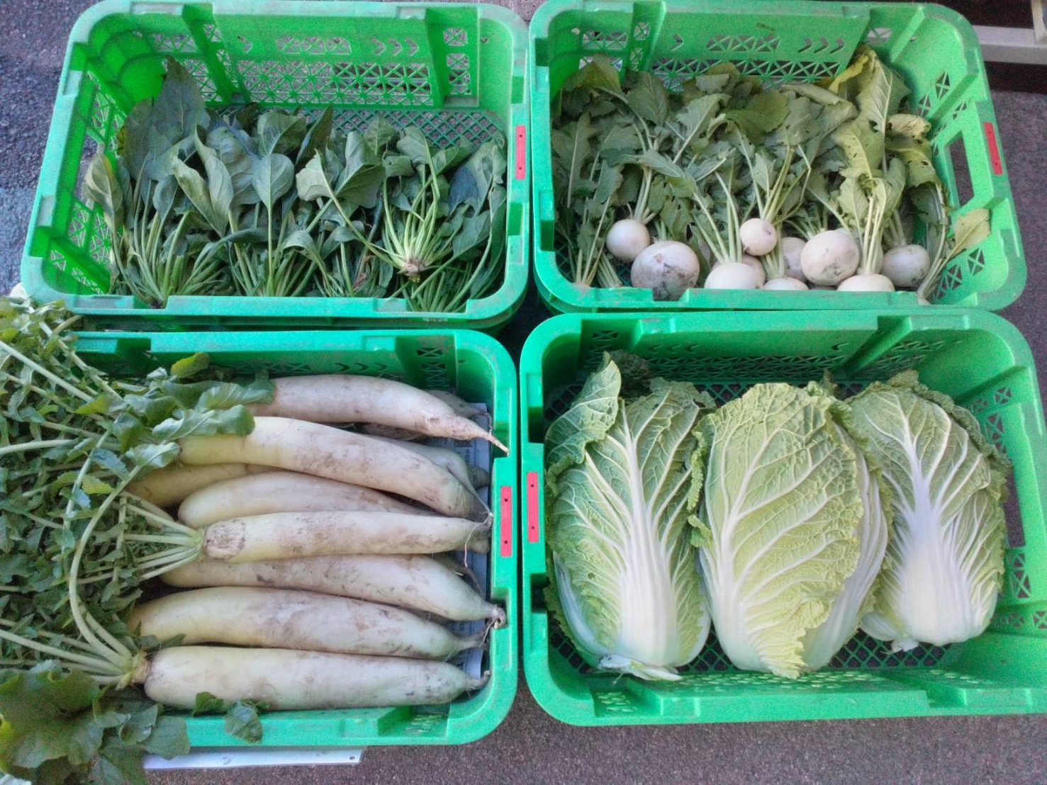 こんにちは! 管理部の丸山です。 今回は、大根、白菜、ほうれん草、カブを収穫しました。 青々と育った大根、ずっしり重みのある白菜、鮮やかなほうれん草、かわいらしいカブ、 どれも畑の恵みをしっかり受けて…